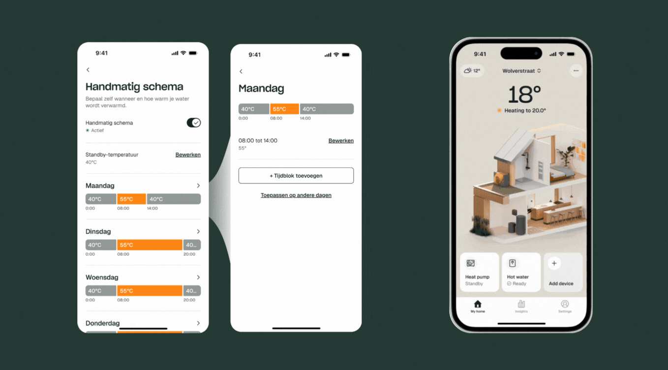 De nieuwe app heeft twee nieuwe handmatige schema’s. Je kan nu zelf een schema maken voor het opwarmen van je boilervat. Zo kan je jouw warmwatermomenten perfect timen.